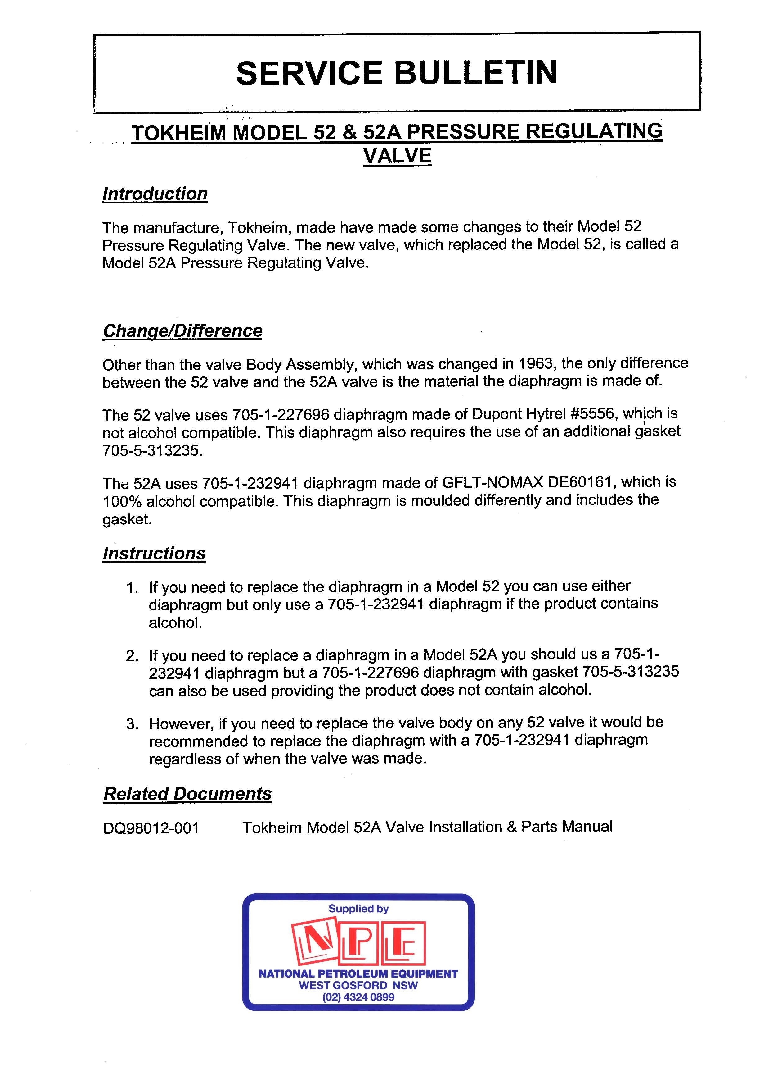 Pls refer to the Service Bulletin below for information relating to differences between the 52 & 52a and the diaphragms.