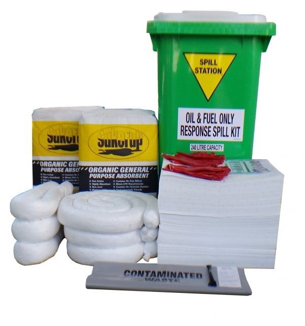 240 L Bin. Oil & Fuel Spill Kit, Makes Short Work Of Your Pooled Or Concentrated Spill. Contains: 150x Oil Fuel Abs Pads (48x43)cm. 3x Abs. Booms (1.2m X 7.5cm), 3x Abs. Booms (3m X 7.5cm), 2x Abs Sweep - 50l Bag. 10x Waste Bags & Ties. 2x Gloves, Cover.