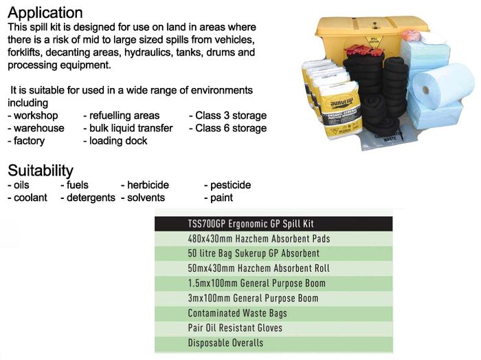 Suitable For General Purpose As Well. Contains: 300x (480x430) Abs. Pads. 5x 50l Bag Absorbent. 1x (50m X 430mm) Abs. Roll. 10x (1.5m X 100mm) Gen. Purpose Boom. 10x (3m X 100mm) Gen. Purpose Boom. 20x Bags. Gloves, Overalls, Goggles And Lockable Bin.