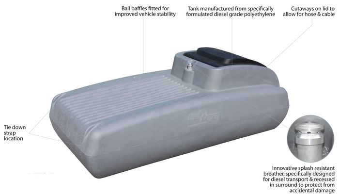 Diesel Unit 450 Litre, Tank Manufactured From Specially Formulated Diesel Grade Polyethylene, Innovative Splash Resistant Breather, Specifically Designed For Diesel Transport & Recessed In Surround To Protect From Accidential Damage, Tie Down Strap Loc.