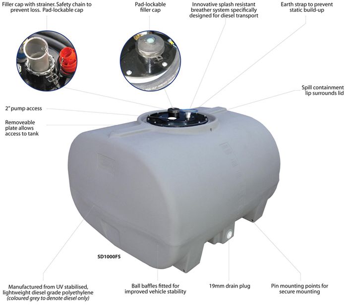 Diesel Tank Free Standing 400 Litres, Removable Plate Allows Access To Tank, Pad-lockable Filler Cap, Filler Cap With Strainer,19mm Drain Plug, Pin Mounting Points For Secure Mounting, Manufactured From Uv Stabilised, Lightweight Diesel Grade Polyethylene