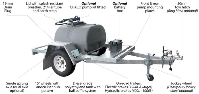 Diesel Trailer 1500 Litre On Road, 15' Wheels With Landcruiser Hub Pattern, Front & Rear Pump Mounting Plates, Jockey Wheel, 50mm Tow Hitch, Diesel Grade Polyethylene Tank With Ball Baffle System, 19mm Drain Plug, Brakes.